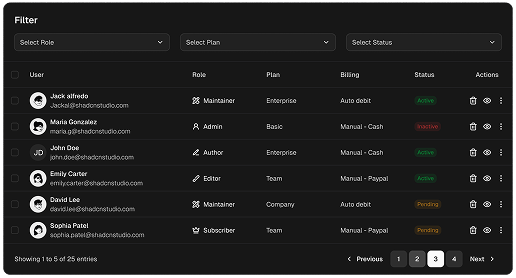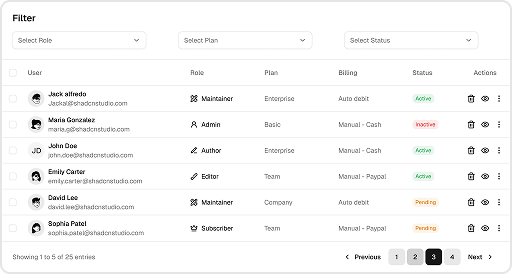 Create responsive, interactive data tables with Shadcn DataTable blocks. Perfect for displaying large datasets with sortable columns and filters.