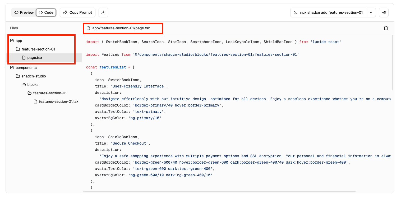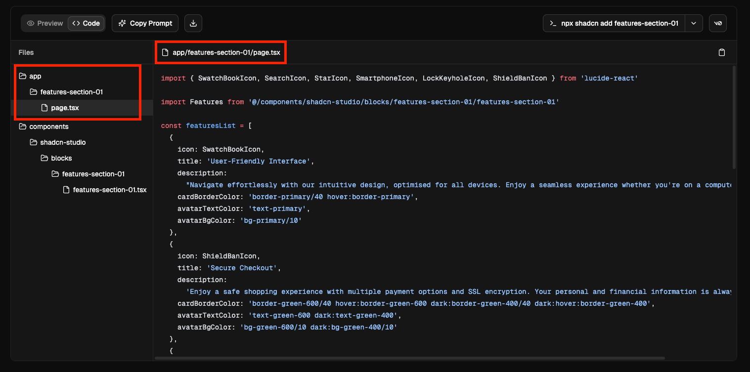 app/block-name/page.tsxand create a new file insidesrc/components/sections/block-name.tsxand paste the copied data.