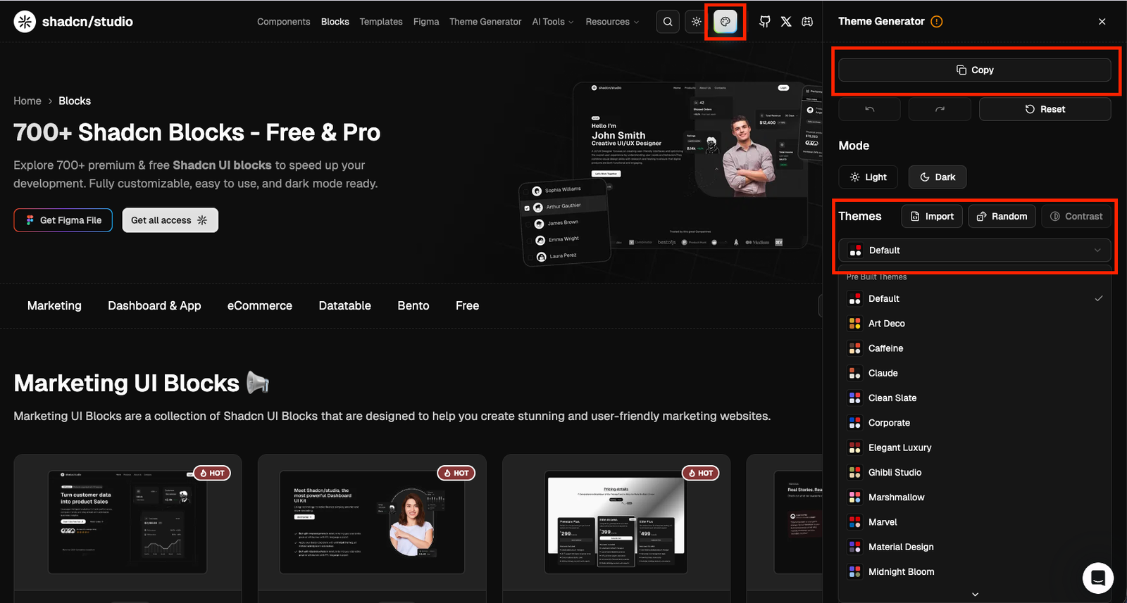 src/app/global.cssand update the theme variables inside:rootand.darkwith the copied values. - Configure font families by following the font setup step 6 to step 8 described in Theme CLI method.