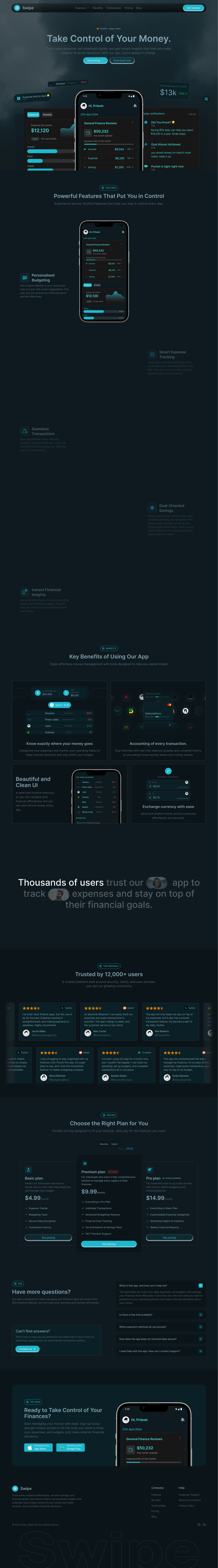 - App-focused sections: hero, feature highlights, benefits, testimonials, pricing, FAQ, CTA, and footer